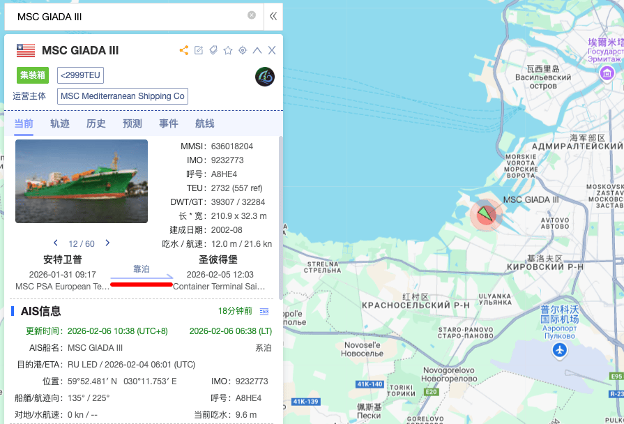 从船舶背景看,"MSC Giada III"为一艘常年服务欧洲—波罗的海—俄罗斯航线的支线集装箱船。公开数据库信息显示,该船船长约210.9米、型宽约32.2米,2002年建造,船龄约24年,挂利比里亚旗。