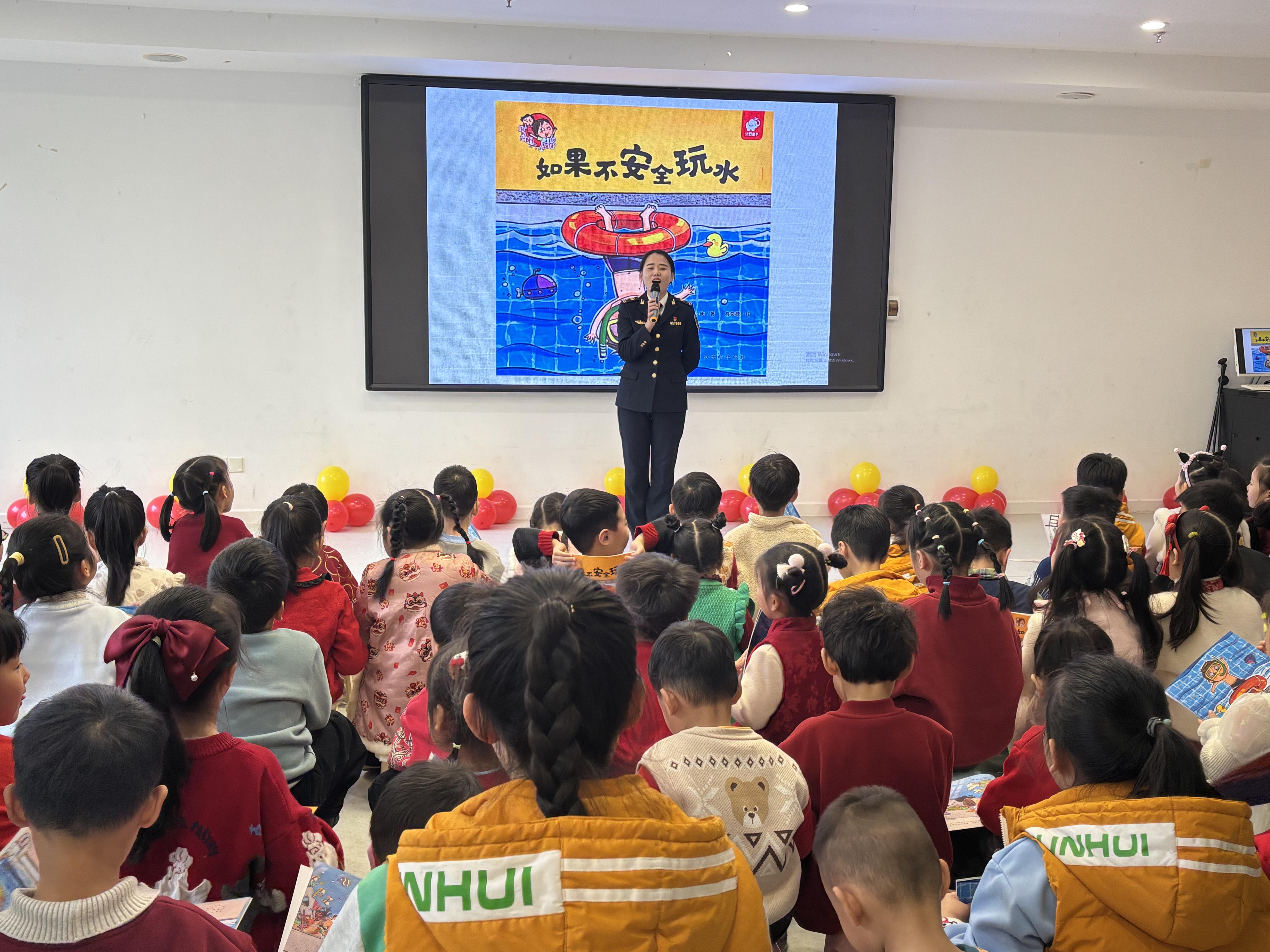 活动以《泳池游玩安全》动画短片拉开序幕。生动形象的画面向孩子们直观展示了泳池中追逐打闹、私自下水等危险行为可能引发的严重后果,帮助他们初步建立起“必须在家长陪同下下水”的安全认知。随后,工作人员借助精美的PPT,以绘声绘色的语言讲述了绘本故事《如果不安全玩水》。故事主人公因不安全玩水而遭遇的一系列麻烦,引发了孩子们的深入思考。在互动提问环节,孩子们争先恐后地举手发言,纷纷表示“不能像书里那样做”,在潜移默化中强化了心中的安全红线。